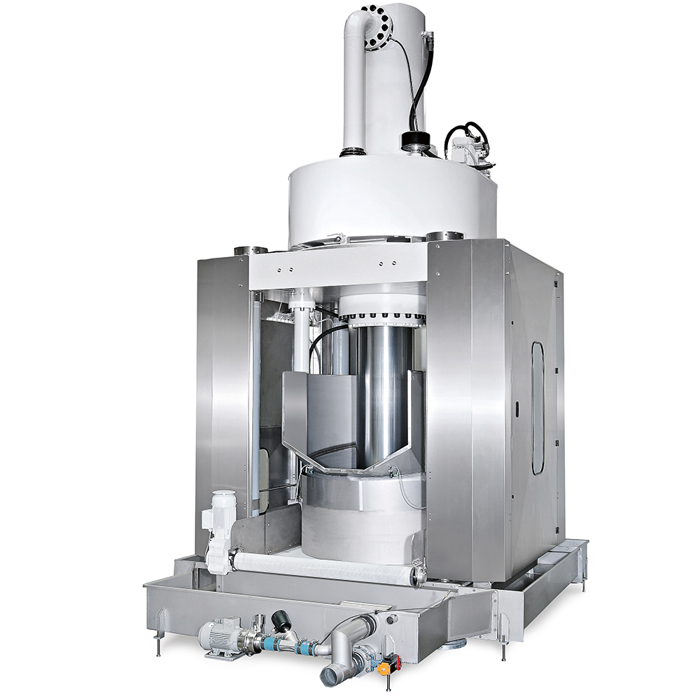 Dazu kommt der große Presskuchen-Durchmesser von 130 cm bei der neuen Entwässerungspresse PP 13, der zu einer um 40 % niedrigeren Höhe des Presskuchens im Vergleich zu einer 1-Meter-Presse führt. Je flacher der Presskuchen, desto effektiver ist die Entwässerung. Die Restfeuchte mit dem neuen System beträgt im neuen Waschsystem hierdurch nur noch 37 %, im Vergleich zu 54 % mit der alten Technik.